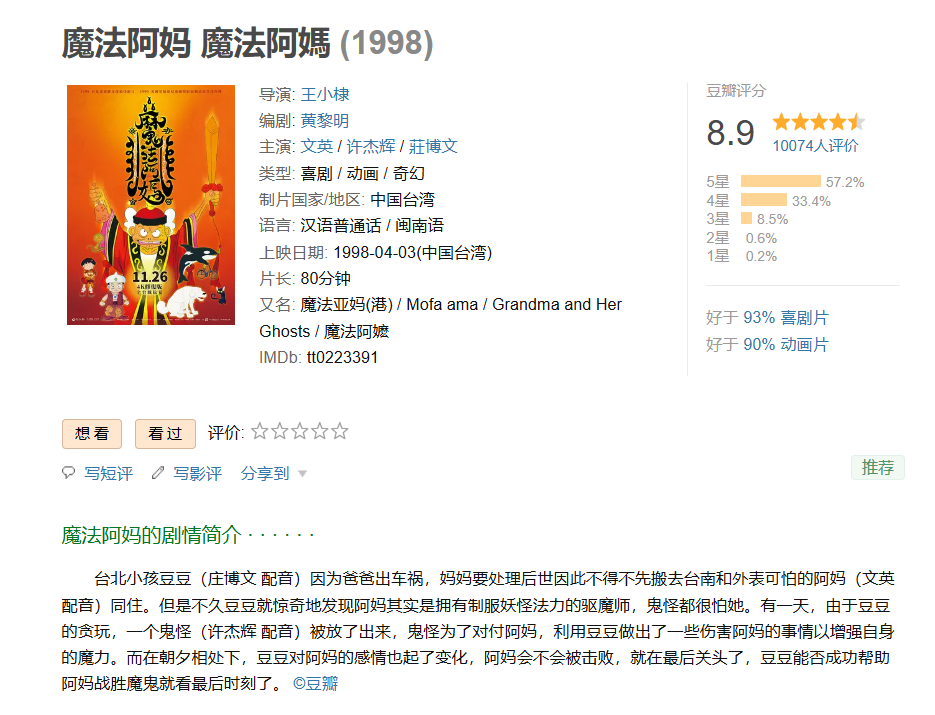 6、❤️【豆瓣8.9分的台湾“鬼节”必播奇幻动画】魔法阿妈【1998】BD1080P [中文字幕] [3.2G]免费观看全集高清网盘资源