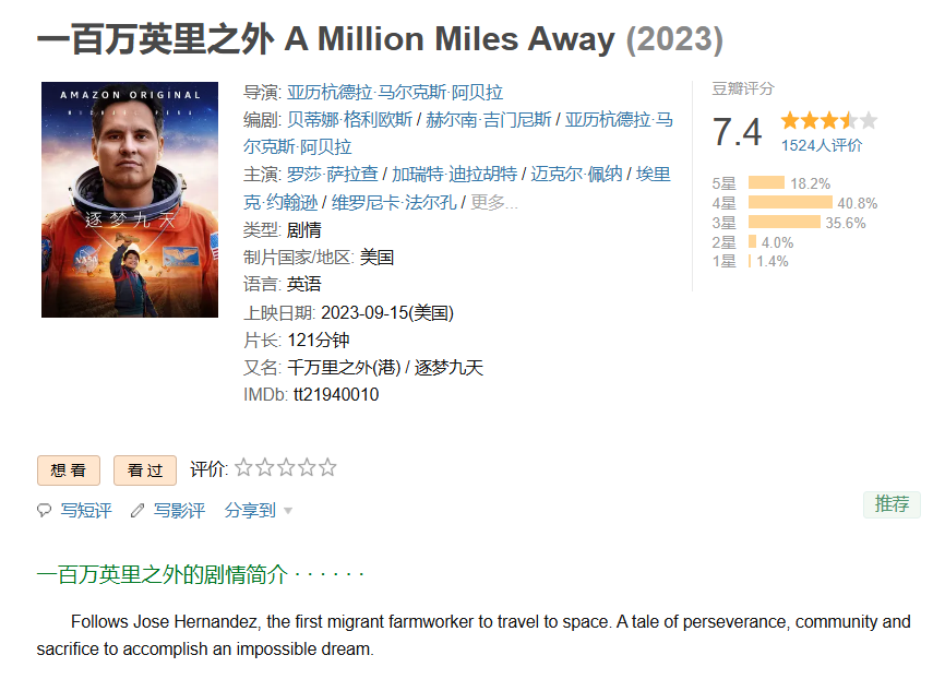 6、❤️【从田野到星空的励志传记片】一百万英里之外【2023】BD1080P [中文字幕] [2.6G]免费观看全集高清网盘资源
