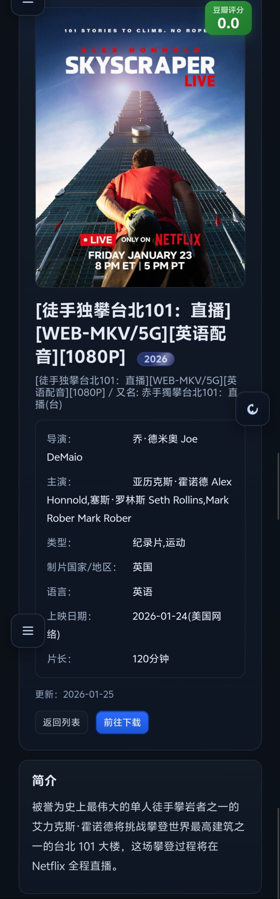 6、[徒手独攀台北101:直播][WEB-MKV/5G][英语配音][1080P] 2026免费观看全集高清网盘资源
